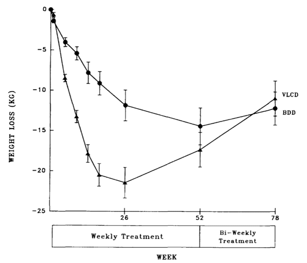 Sur la courbe, le groupe VLCD (Very Low Calorie Diet) chute vite au départ, mais stagne ensuite, puis reprend du poids. À l’inverse, le groupe à déficit modéré (BDD) perd moins au début, mais garde le cap sur la durée. Pourquoi ? Parce que manger peu, mais pas trop peu, reste tenable sur le long terme.