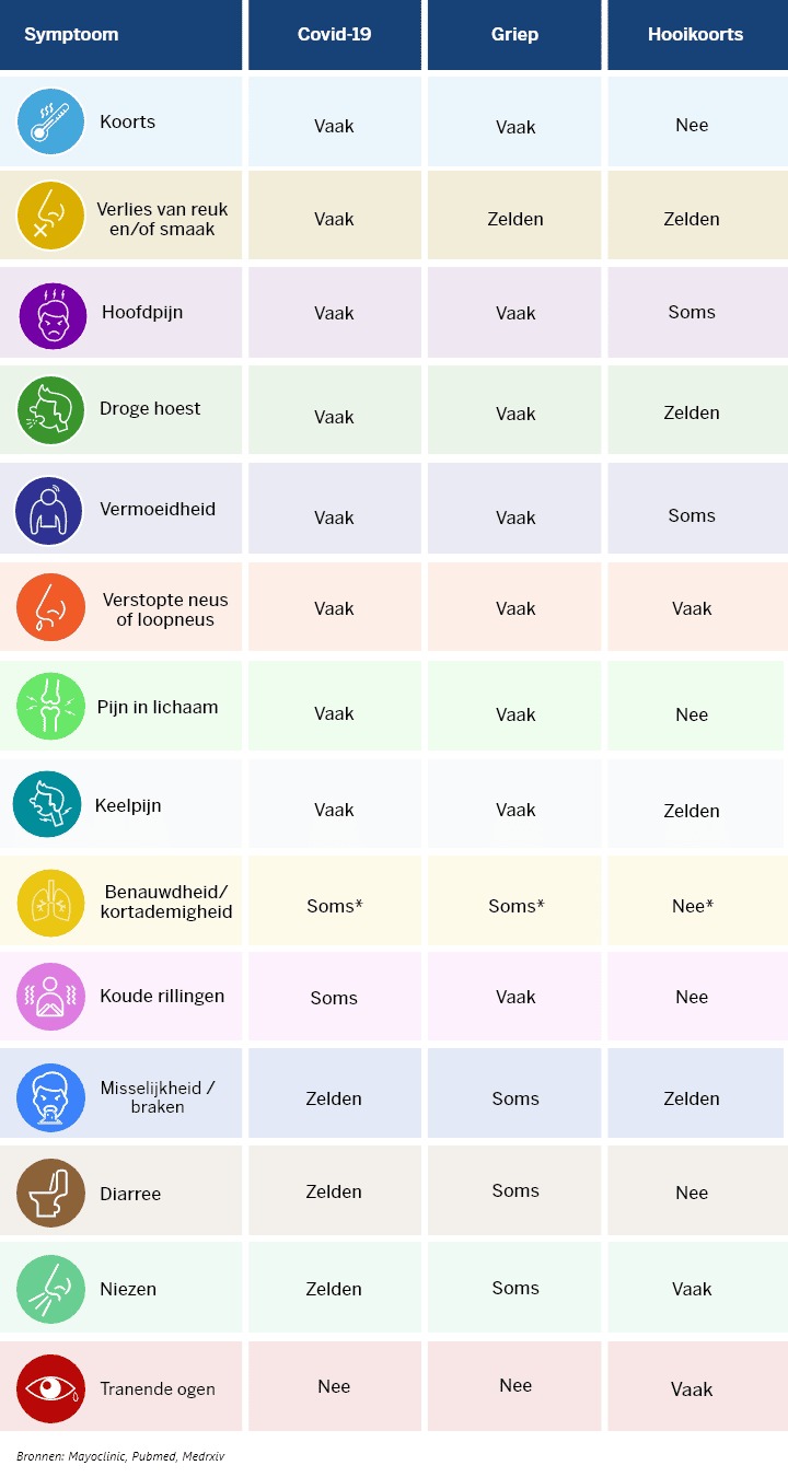 *Pour Covid-19 et la grippe, l’essoufflement se constate surtout lors d’une hospitalisation. Le rhume des foins, lui, peut provoquer une congestion nasale, surtout chez les personnes asthmatiques. Vous souhaitez intégrer cette infographie sur votre site ? Il suffit simplement d’ajouter un lien vers Zorgwijzer.